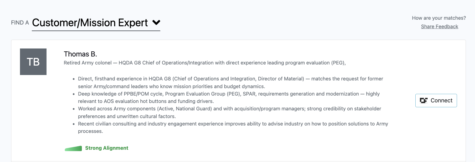 **Each SME is matched based on relevant experience to the specific opportunity, providing expert guidance that can improve win probability.**