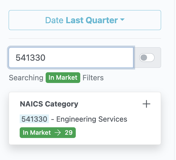Let's say we want to find new entrants who have won contracts under 541330. I would enter 541330 into the search bar, and then click the + button on "NAICS Category" button: