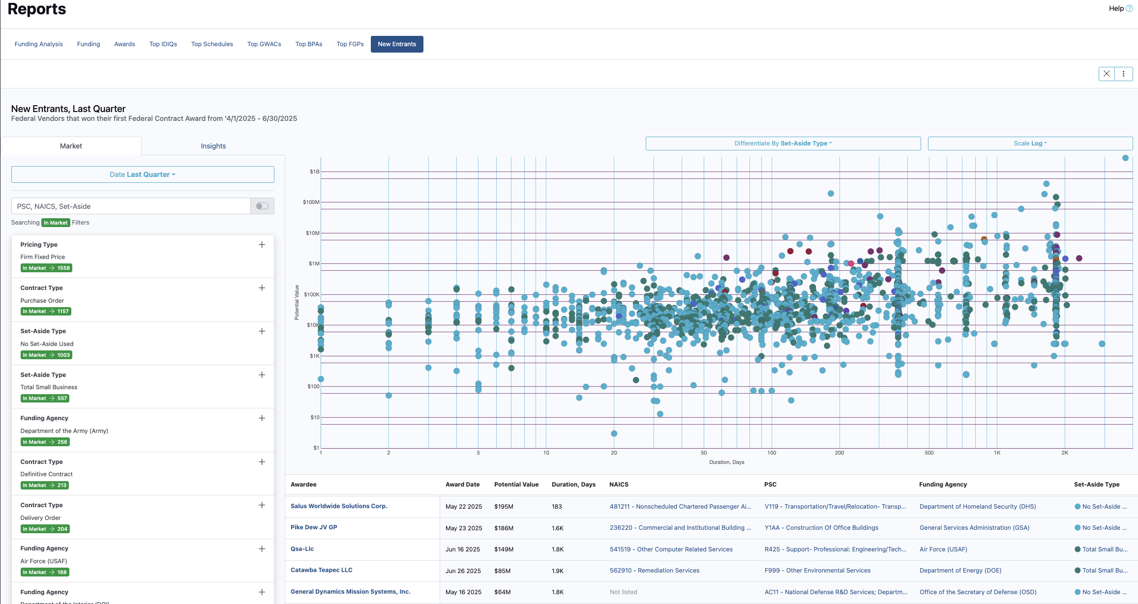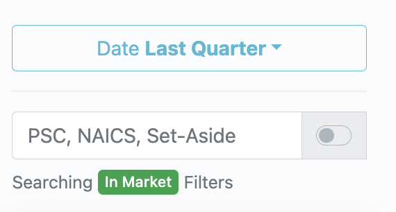 This adds 541330 as a filter. Now when I view the report in the center of the page I will see new entrants who have just won contracts under 541330 last quarter. If I want to change the time frame of the report, just select the "Date" drop down. Feel free to add additional filters to further focus your report.